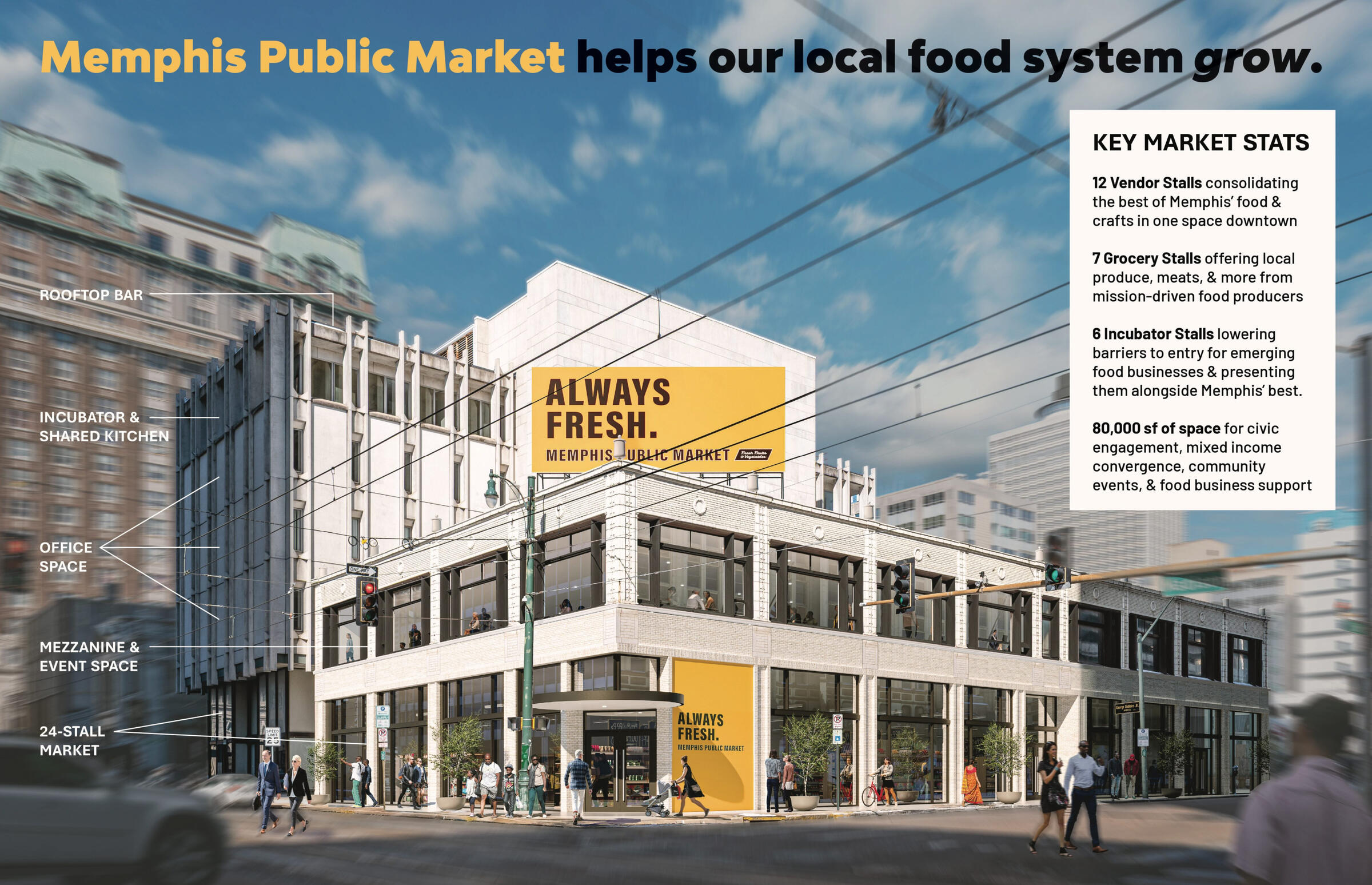 Memphis Public Market is a tourist destination for culinary travelers. It is a thriving third space for Memphians of all income levels to shop for healthy, local food. It is an economic driver, incubating new jobs and elevating small business owners. And, it is a showcase of the mission behind the market: elevating local food & craft entrepreneurs to broaden their audience, strengthen their business, and ultimately thrive.At the corner of BB King & Madison Avenue, in the heart of Downtown Memphis, the new Memphis Public Market will offer 24 stalls for local food purveyors, farmers, & entrepreneurs, elevate food access through community programming, and support food entrepreneurs with an in-house incubator.