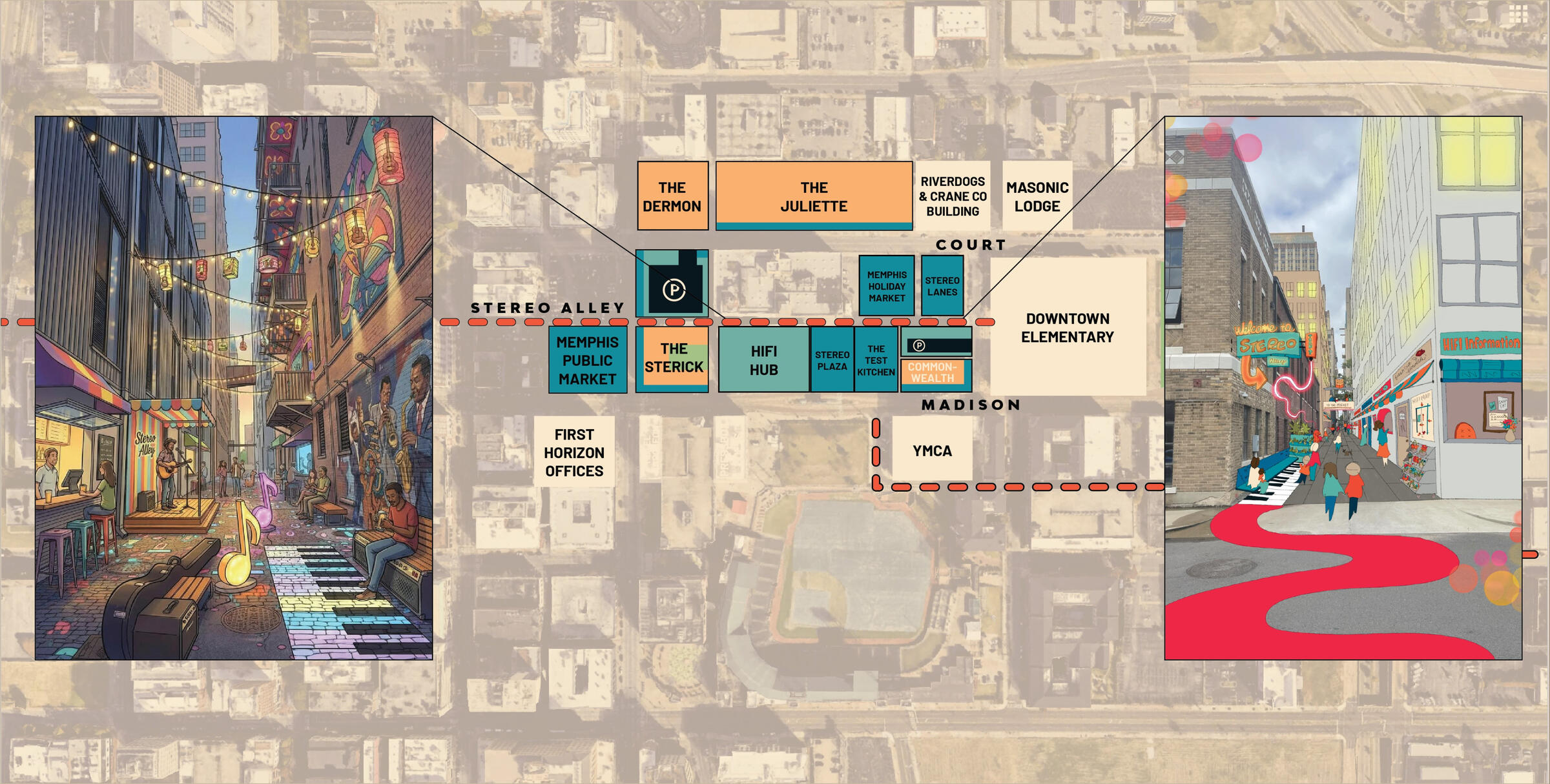 Leveraging the momentum of the redevelopment of the historic Sterick Building, HiFi Memphis aims to promote thriving third spaces, healthy affordable housing, and entrepreneurship support, threaded together through dynamic public art and programming in the blocks surrounding The Sterick.Specifically, the HiFi District includes the blocks bounded by Court Square Park & Danny Thomas Blvd to the East & West; Autozone Ballpark & Jefferson Avenue to the North & South. This area is anchored on Stereo Alley, a historic and currently-underutilized alley that threads through the district's center.